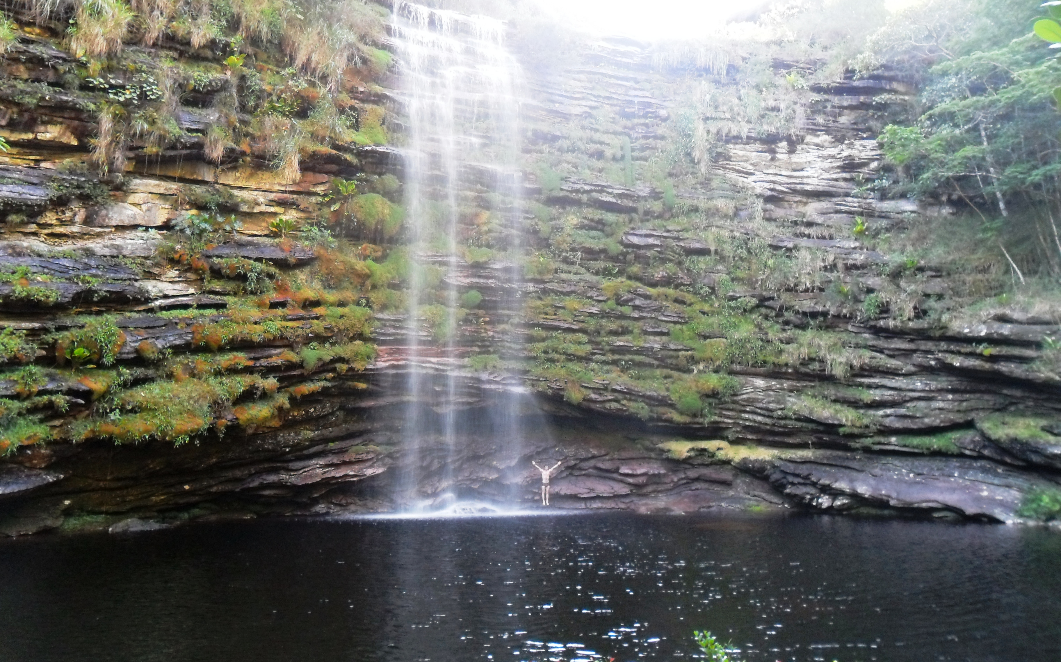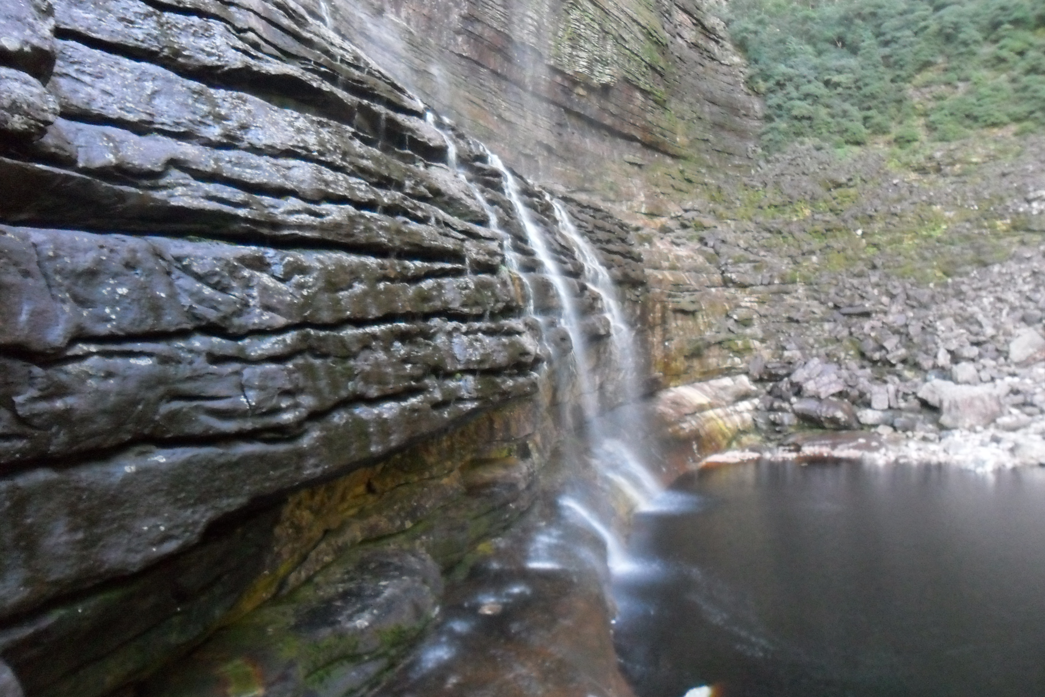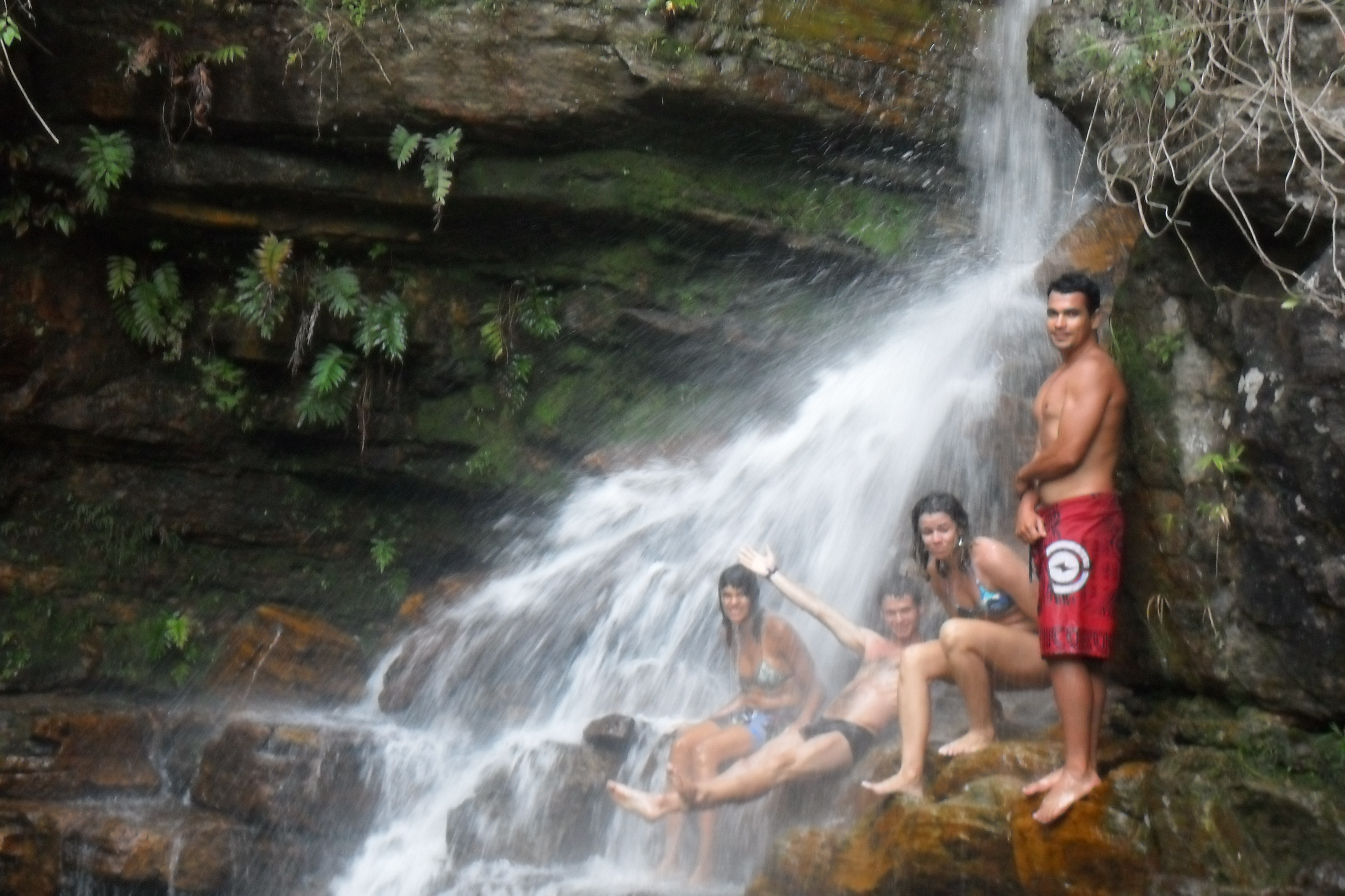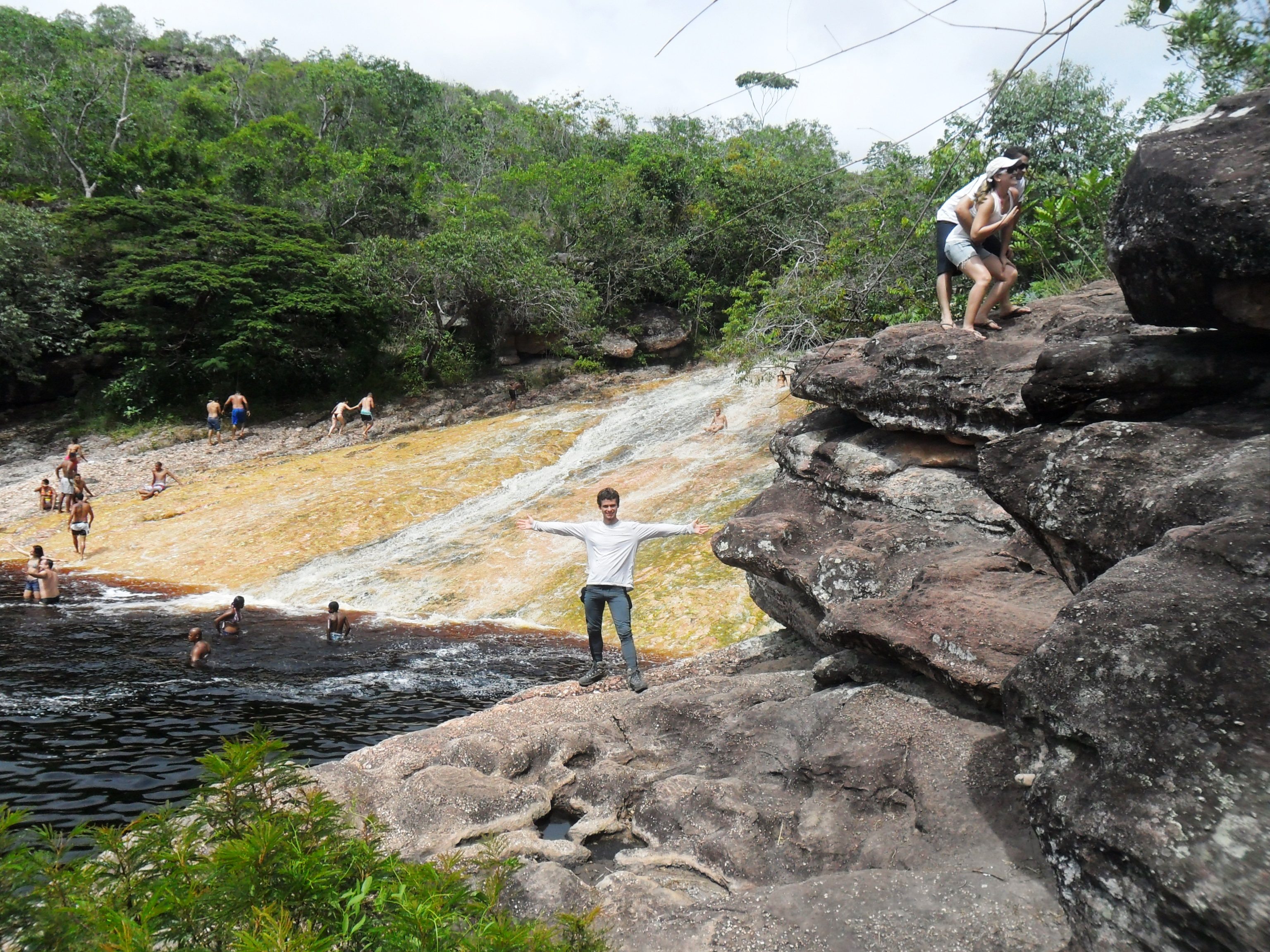 Cheguei na cidade por volta das cinco da manhã, caminhei um pouco, comprei um mapa na loja dois irmãos, abasteci minha mochila com os últimos alimentos incluindo uma garrafa de vinho. Depois tomei um café da manhã reforçado e às 9h com a cargueira nas costas parti sozinho em direção ao Ribeirão do Meio. O caminho até lá é bem tranquilo. É um lugar bem divertido onde se forma uma espécie de tobogã e se pode escorregar na cachoeira. Também está cheio de poços onde se pode tomar banho à vontade.