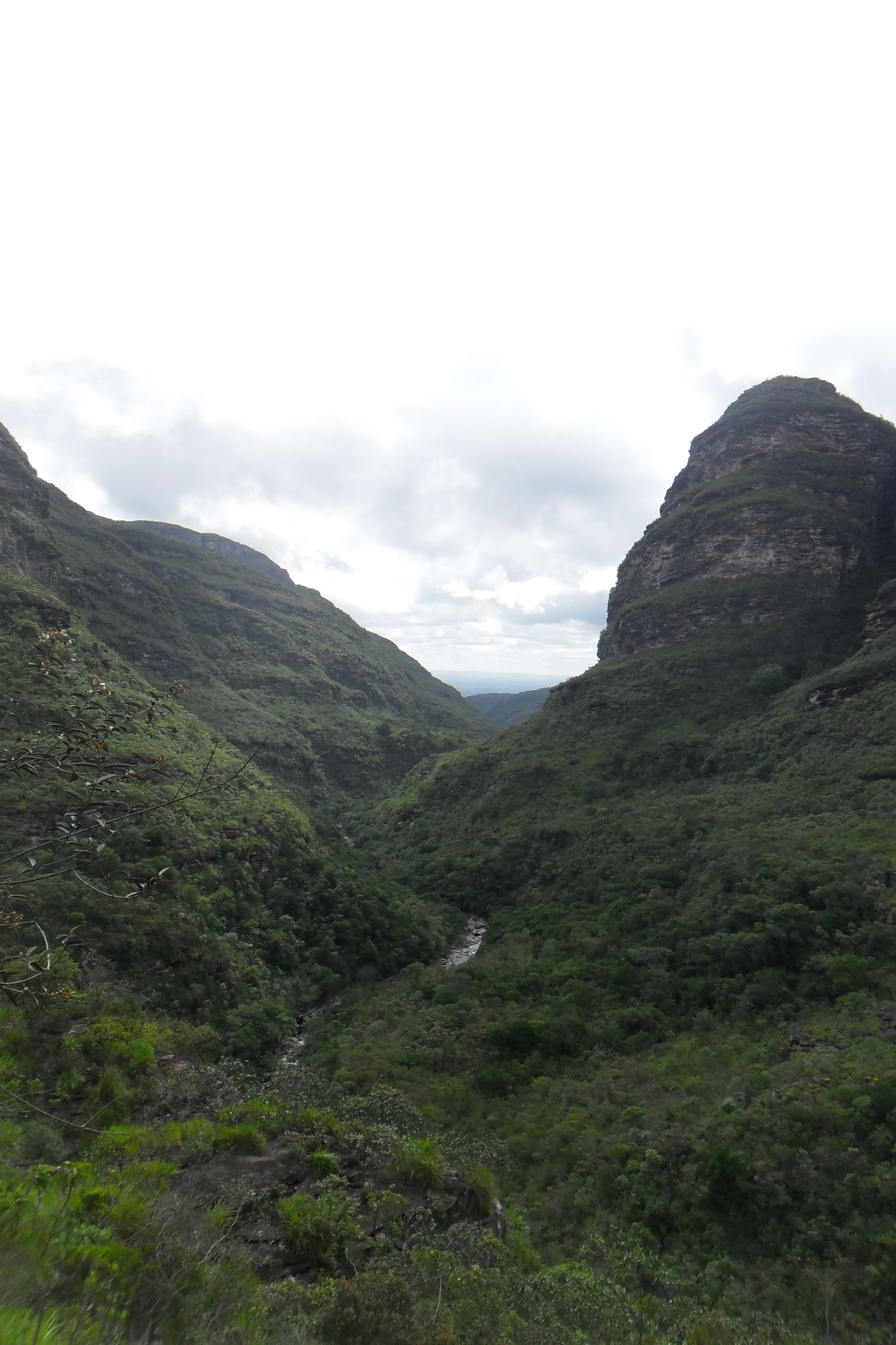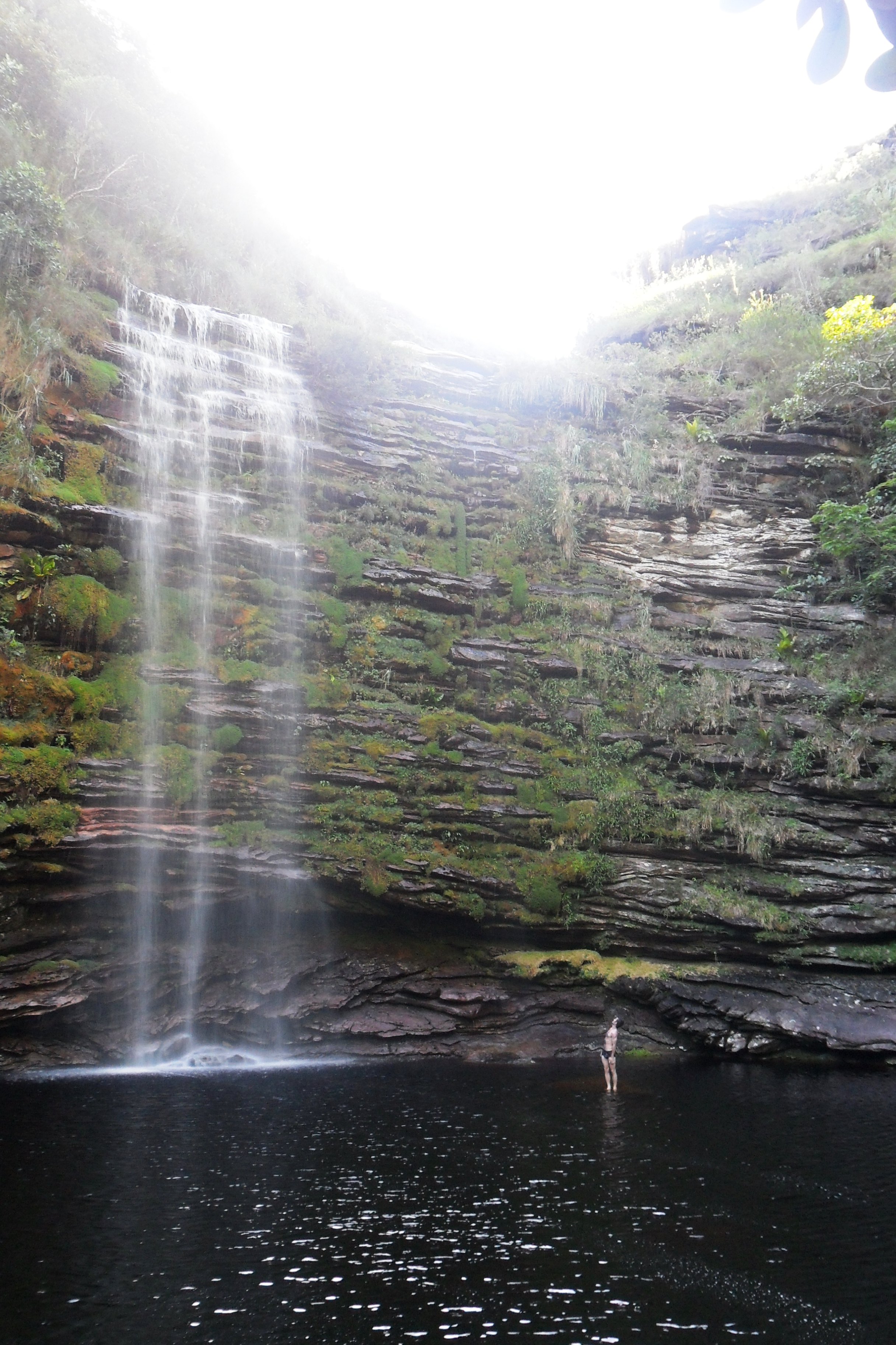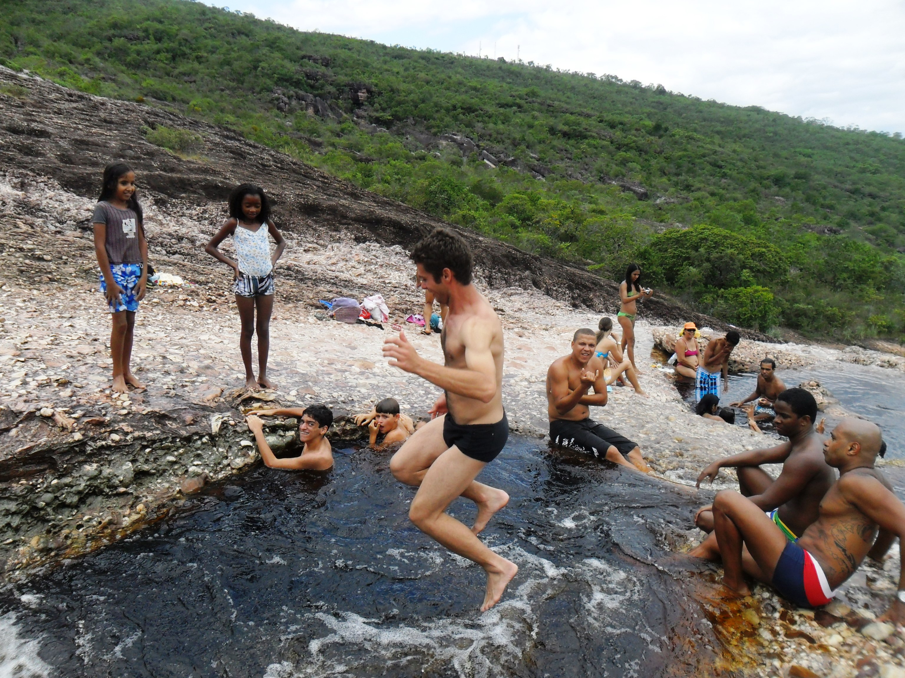 Cheguei na cidade por volta das cinco da manhã, caminhei um pouco, comprei um mapa na loja dois irmãos, abasteci minha mochila com os últimos alimentos incluindo uma garrafa de vinho. Depois tomei um café da manhã reforçado e às 9h com a cargueira nas costas parti sozinho em direção ao Ribeirão do Meio. O caminho até lá é bem tranquilo. É um lugar bem divertido onde se forma uma espécie de tobogã e se pode escorregar na cachoeira. Também está cheio de poços onde se pode tomar banho à vontade.