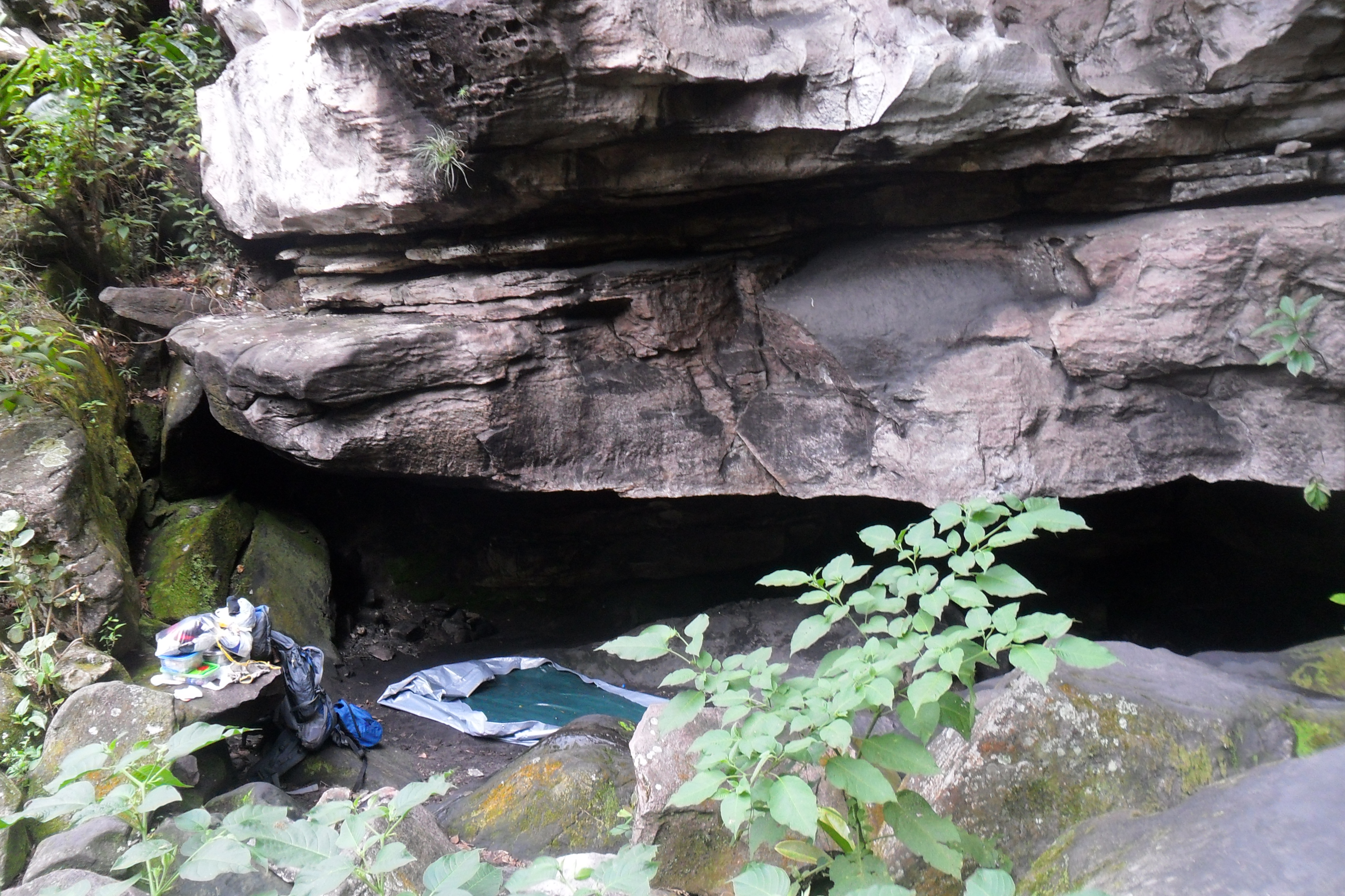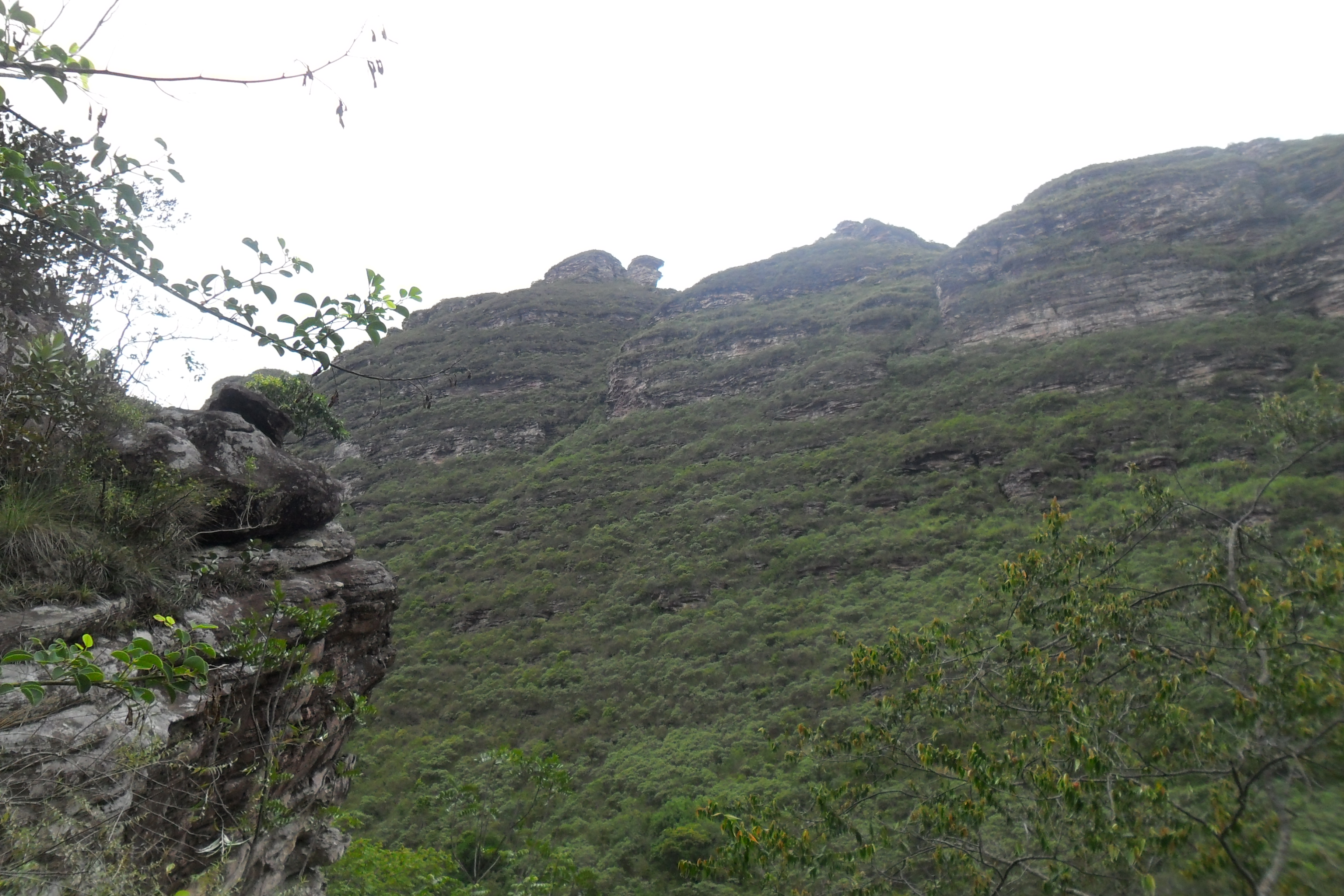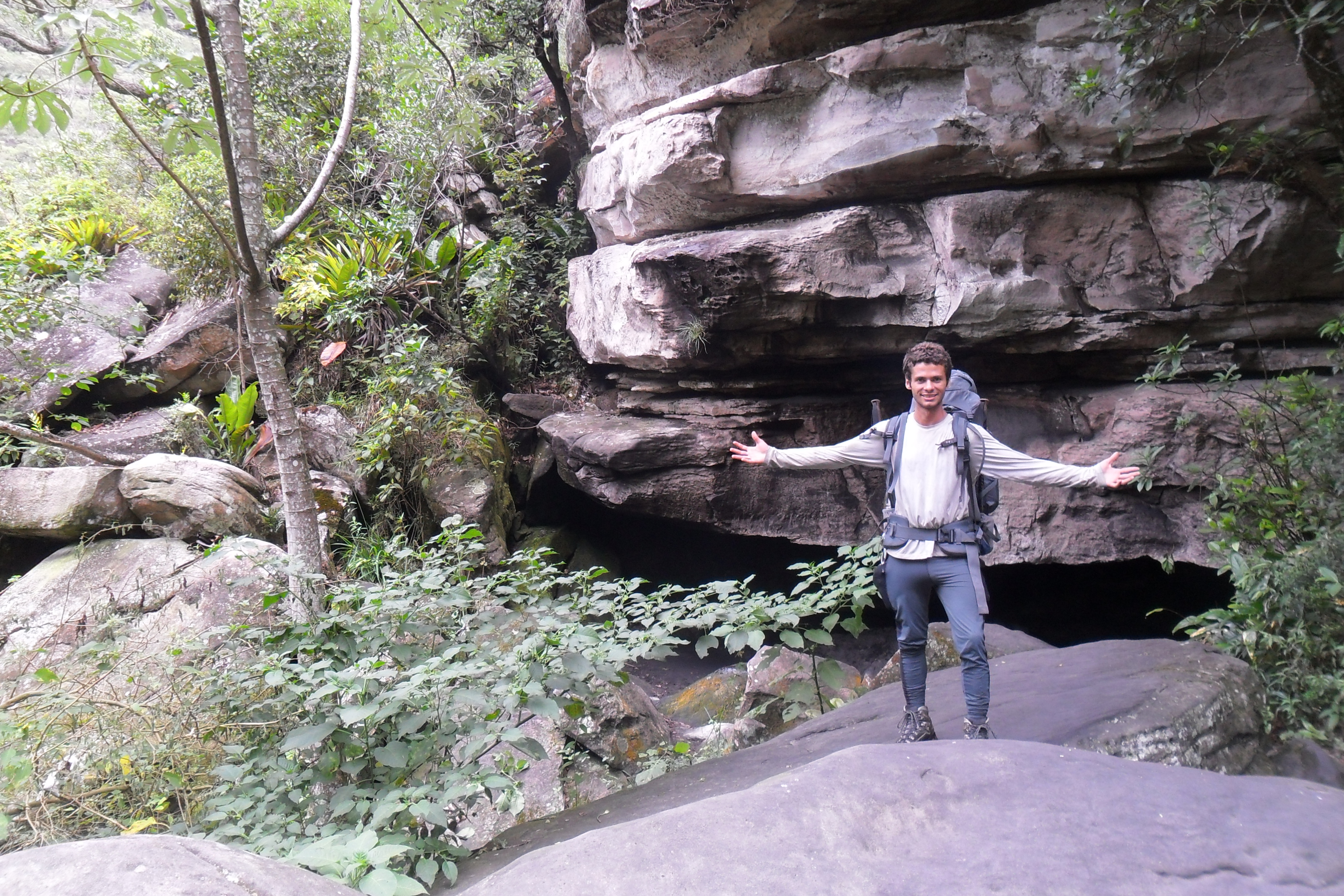Após me refrescar no ribeirão do meio, segui a trilha logo acima do escorrega. É o começo da serra do veneno. Pense em uma subida íngreme. Dura em média 2h. Nos primeiros 10 minutos já tinha suado litros e litros. Um calor fortíssimo, sem qualquer vento e a subida era interminável. Para se localizar basta seguir as marcas de desgaste nas pedras. Ao meio-dia cheguei a um local com algumas construções inacabadas, logo indo em direção ao conjunto montanhoso em frente encontrei um caminho bem batido e plano, mas que depois continuava através de uma forte subida. Um pouco mais acima encontrei um grupo com um guia. A partir deste ponto, mantive a direita bem perto da encosta e logo a seguir comecei a descer no sentido de cruzar o córrego da Muriçoca e alcançar a montanha do outro lado. Feito isso, ainda por uma trilha bem batida, subi em direção à primeira toca, a da Onça. Cheguei lá às 13h. Geralmente os grupos não levam barracas, acabam dormindo em sacos de dormir dentro de pequenas cavernas apelidadas de tocas. Havia um grupo de baianos por lá, conversei um pouco com eles. Era a sexta vez que faziam o trajeto e admiraram minha coragem por trilhar sozinho por aquelas bandas.