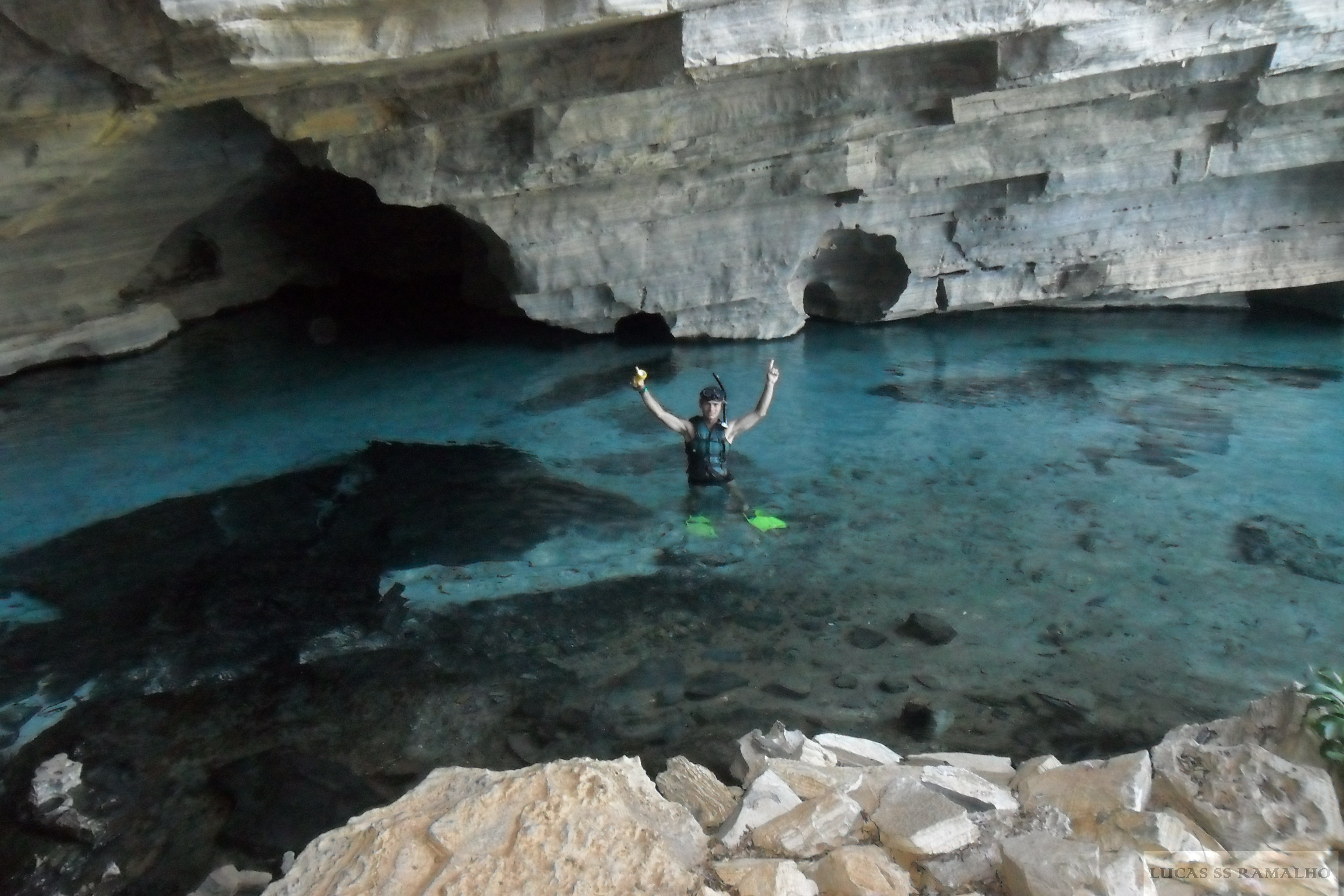 Acordei cedo. Tomei um bom café da manhã e parti em direção à toca do Macaco subindo o rio Capivara. Levei 1h. A toca maior fica do outro lado do rio que vem da Fumaça. É preciso cruzá-lo. Escondi minha cargueira por perto e segui na trilha da fumaça por baixo. A trilha começa pela direita, mas 95% dela está localizada na metade esquerda do percurso. Logo após a passagem pelas pedras grandes, ela muda de lado. Eu descobri isto na volta. Na ida fui pela direita caminhando por pedras bem escorregadias. Encontrei uma cobra-espada de meio metro no percurso. Antes de se chegar ao poço já é possível avistar a incrível queda d’água que parece de fato como uma cortina que vai se movendo conforme o vento. Eram 13h30min. Tomei um ótimo banho gelado. Não havia ninguém por lá. Desfrutei do sol e às 15h comecei a volta. Uma hora e meia depois já estava chegando na toca quando avistei um outro casal ao longe, estavam nus. Escutaram minha aproximação e prontamente se vestiram. Eu conversei com eles um pouco, disse que iria pegar minha cargueira do outro lado do rio e voltaria em direção à toca. Já na toca preparei minha comida quando chegou um grupo com dois franceses, um mexicano, Mário, e um guia. Conversei bastante com o Mexicano que já havia visitado a Índia e estava agora conhecendo o Brasil. Depois bati um papo com o guia que me contou casos a respeito das trombas d’água que ocorrem na região. Assustador. Ele contou que a toca que eu fiquei na noite anterior poderia ficar submersa caso chovesse na cabeceira do rio e uma tromba d’água viesse arrastando tudo. Era preciso ficar atento às chuvas que rolam à noite na região, pois o rio subia em questão de segundos e não havia tempo de salvar nada. Dormi mais cedo junto com os outros. Apenas os ratos estavam acordados buscando por comida que geralmente sobra dos trilheiros. Para ficar tranquilo, tinha amarrado minha comida no teto da caverna. Já o o guia me contou que acordou às 4h incomodado com uma briga de duas ratazanas enormes.