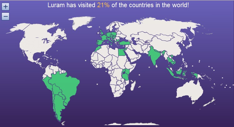 Até agora estive em 45 países ao redor do mundo. O que incrivelmente equivale a 21% dele. Ou seja: ainda há muito que se conhecer. Viajar é para sempre. Abaixo envio a lista de todos eles discriminados por continentes. Observe que incluí Tibete e Palestina como Países independentes, pois acredito que assim deveriam ser. O Brasil também entra na conta, afinal de que vale conhecer o mundo sem conhecer aquilo que está aqui mais perto. Se pudesse somar todo o tempo que estive fora do Brasil viajando chegaria a aproximadamente um ano e meio. Incluindo o Brasil, dois anos.